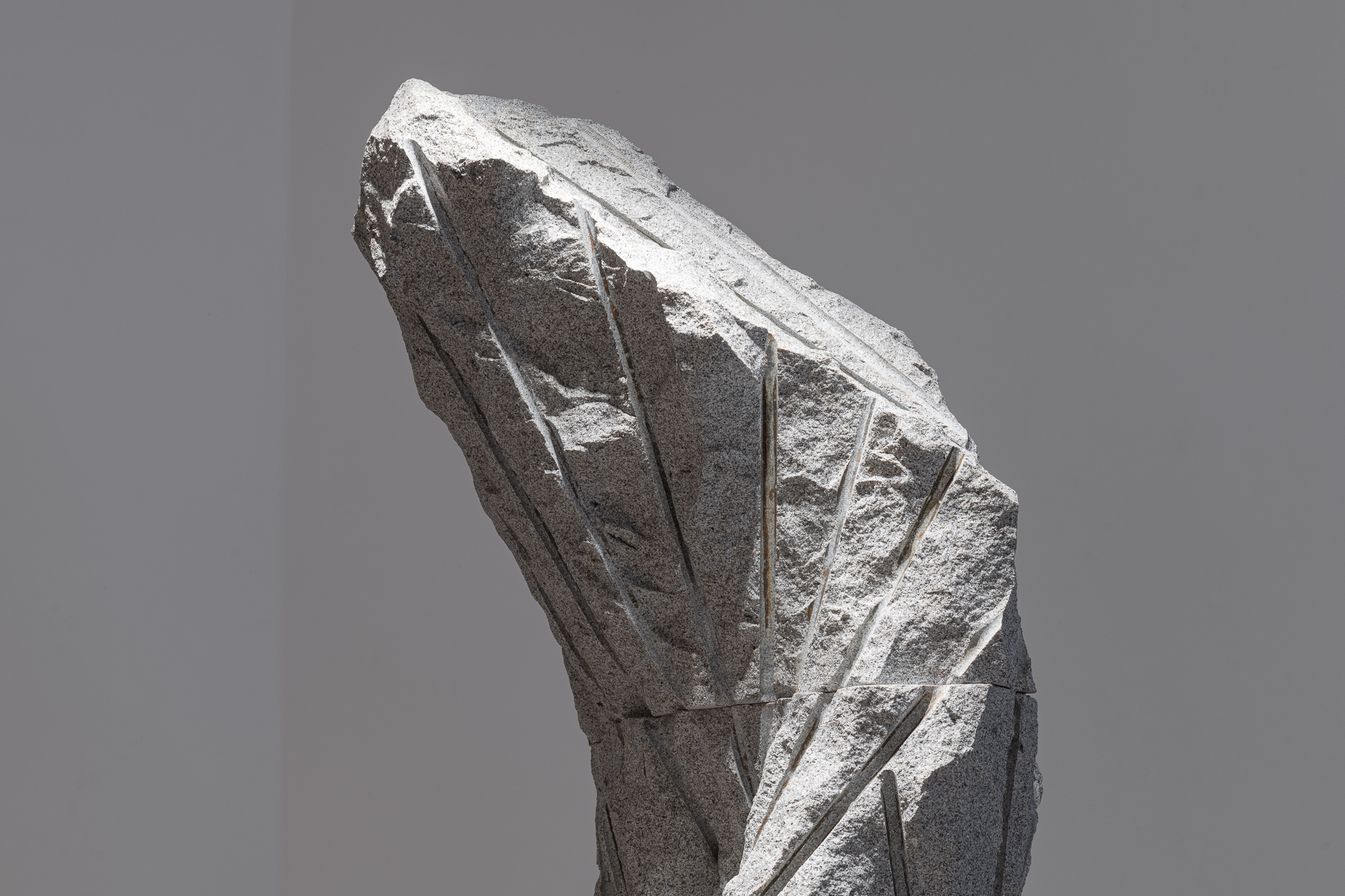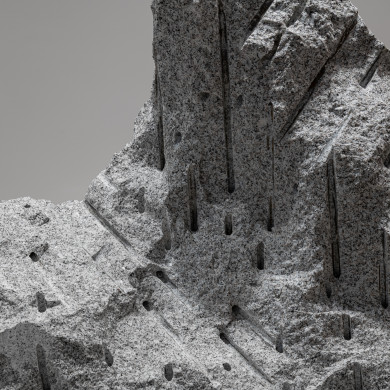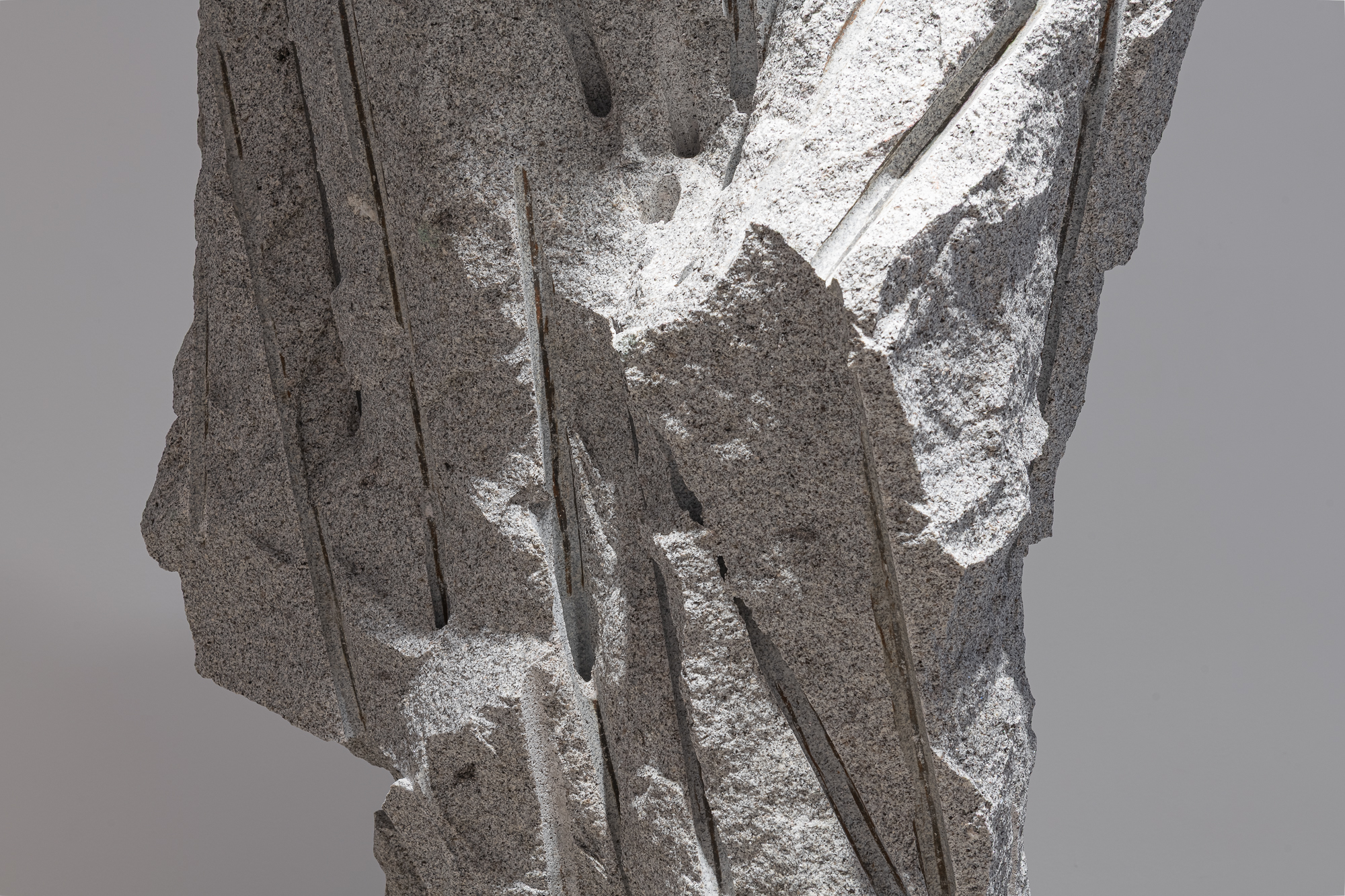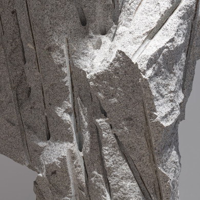 Papčo’s latest works emerge from the same movement of extraction, tension, and impulse. The artist explores processes of transformation through drilling and revealing—operations inherent to traditional stone-carving techniques. The sculptures exist in a liminal zone where the mineral, usually perceived as inert, becomes a bearer of (nascent) motion. The One Who Breathes illustrates this dynamic: a form in the process of becoming, barely separated from the granite that still contains it, carries the traces of its tearing-away as signs of a mineral birth. A mass of stone, marked by direct drillings during extraction, retains traces of its separation. The sculpture appears as a transitional state, a witness to the tension between stillness and motion, between the form already contained and the form being born.