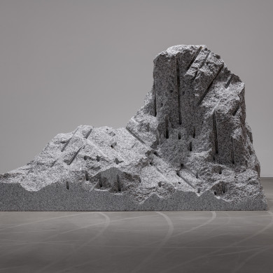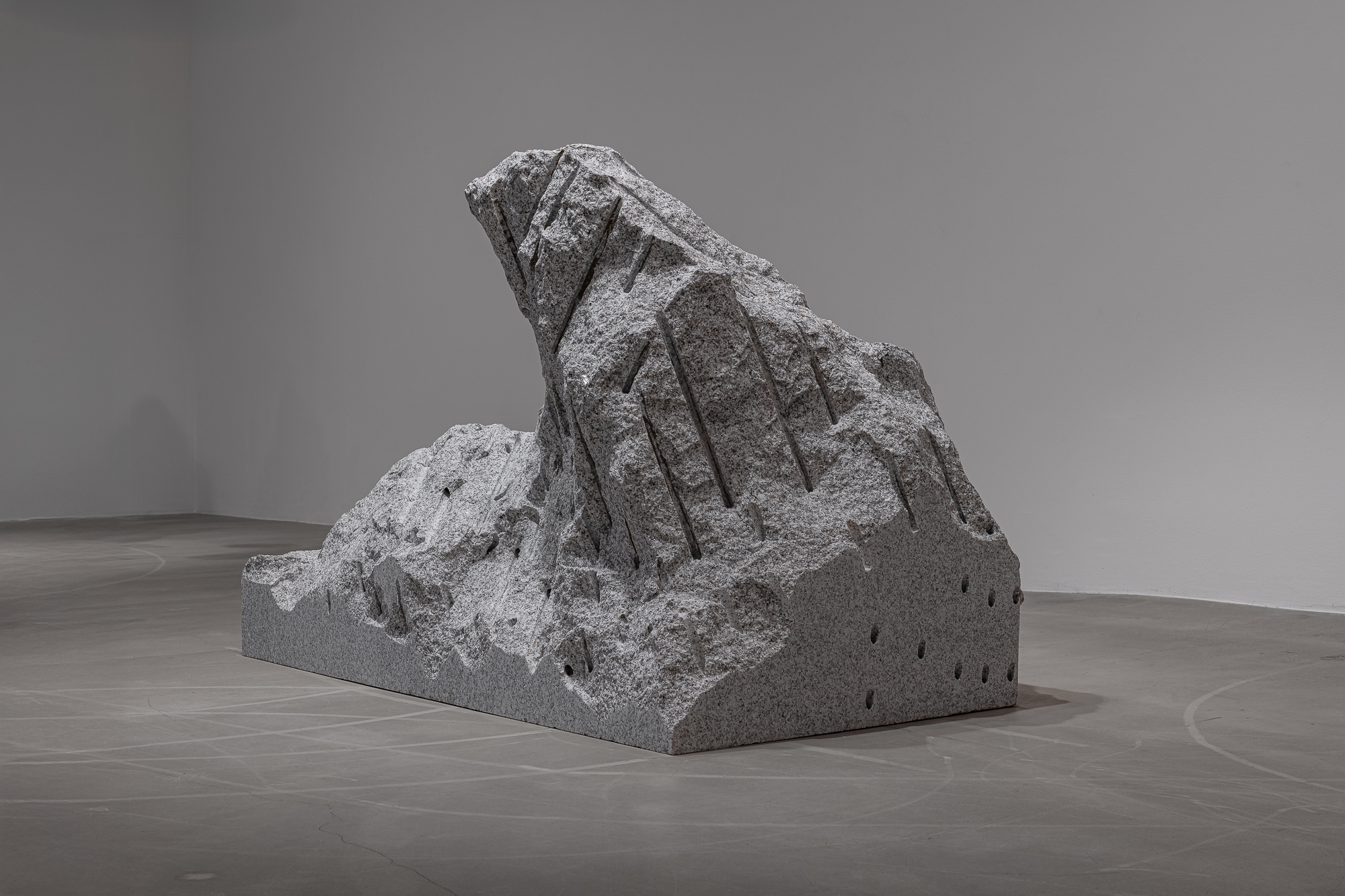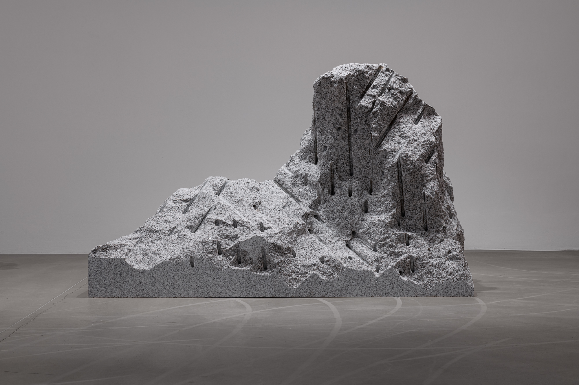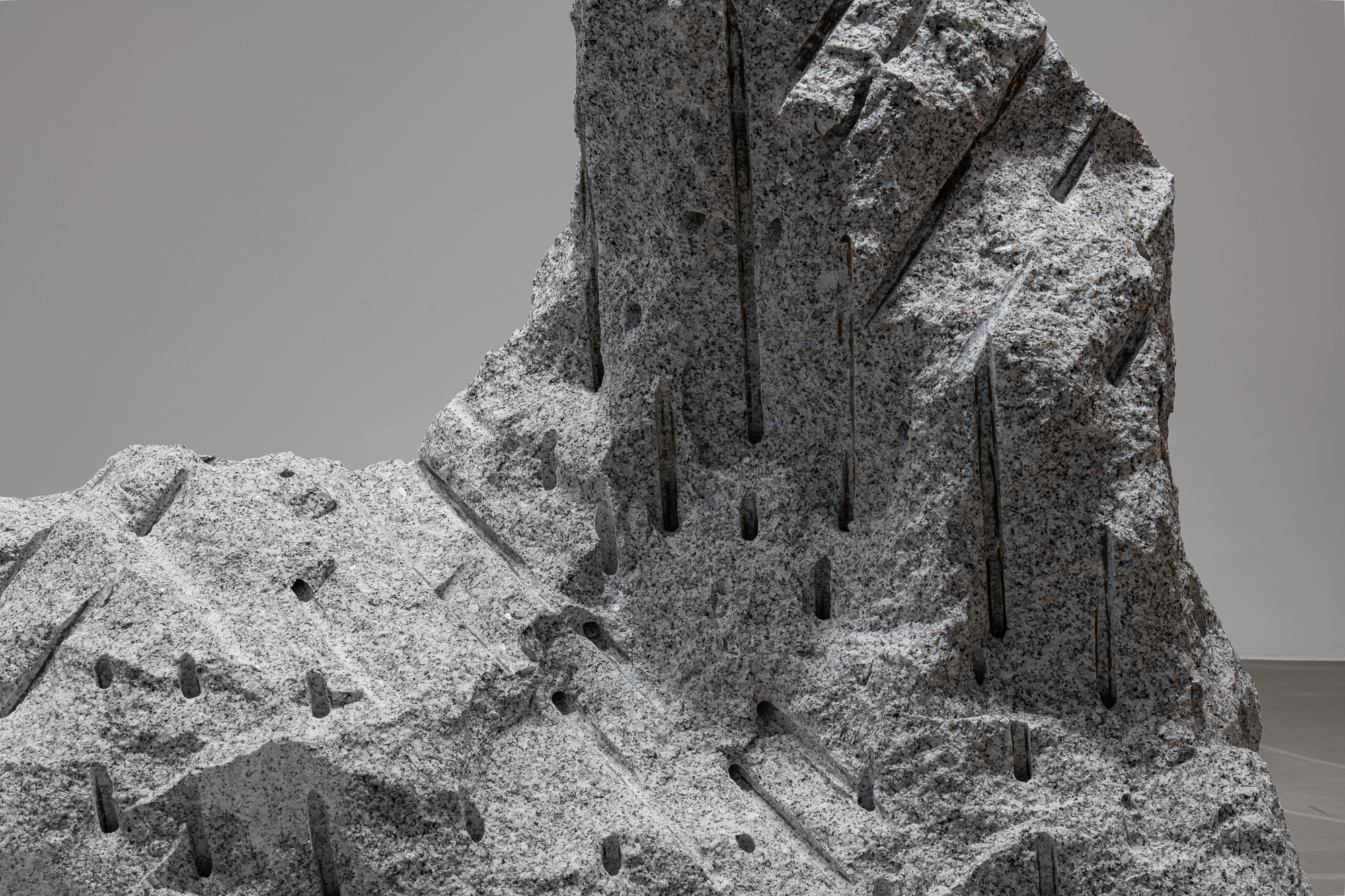 Papčo’s latest works emerge from the same movement of extraction, tension, and impulse. The artist explores processes of transformation through drilling and revealing—operations inherent to traditional stone-carving techniques. The sculptures exist in a liminal zone where the mineral, usually perceived as inert, becomes a bearer of (nascent) motion. The One Who Breathes illustrates this dynamic: a form in the process of becoming, barely separated from the granite that still contains it, carries the traces of its tearing-away as signs of a mineral birth. A mass of stone, marked by direct drillings during extraction, retains traces of its separation. The sculpture appears as a transitional state, a witness to the tension between stillness and motion, between the form already contained and the form being born.