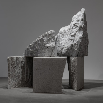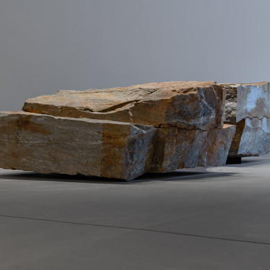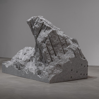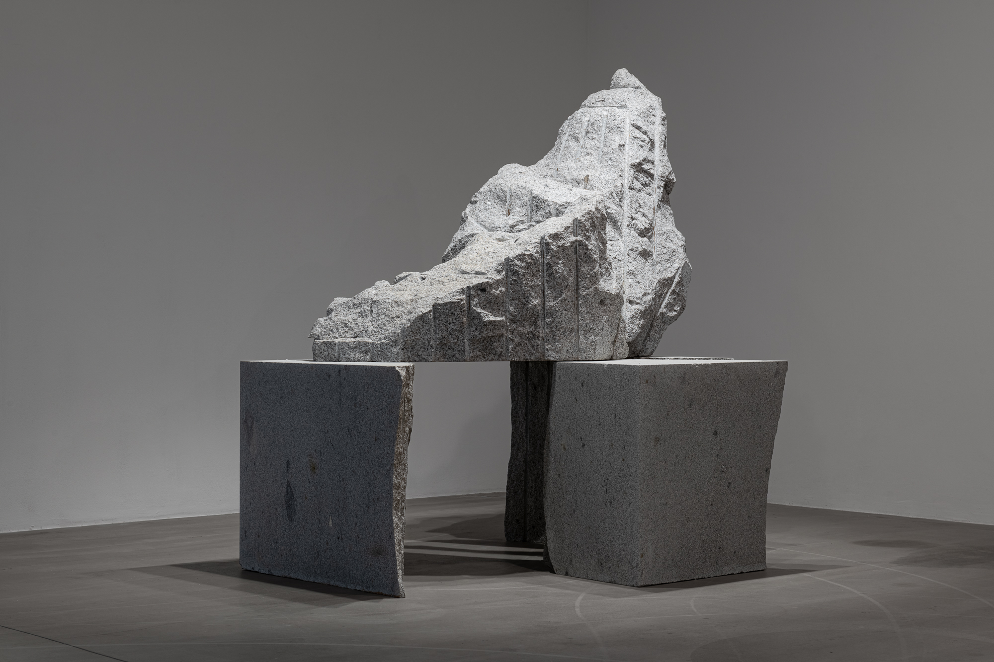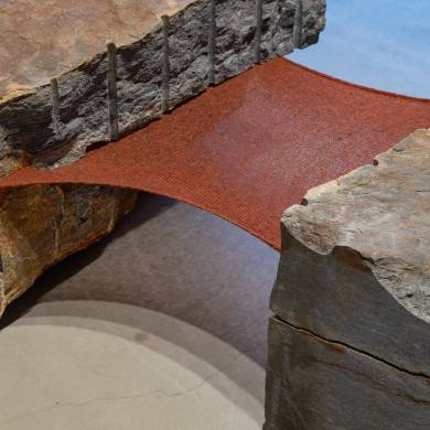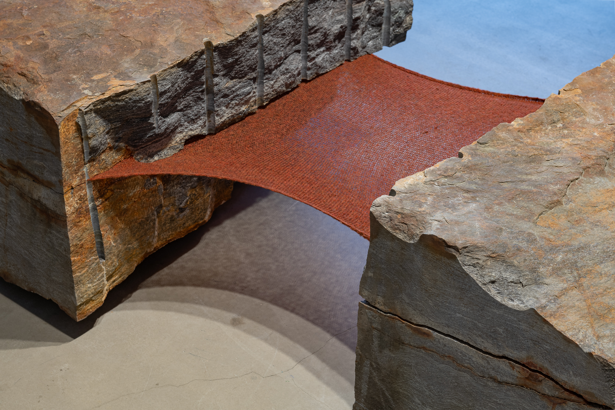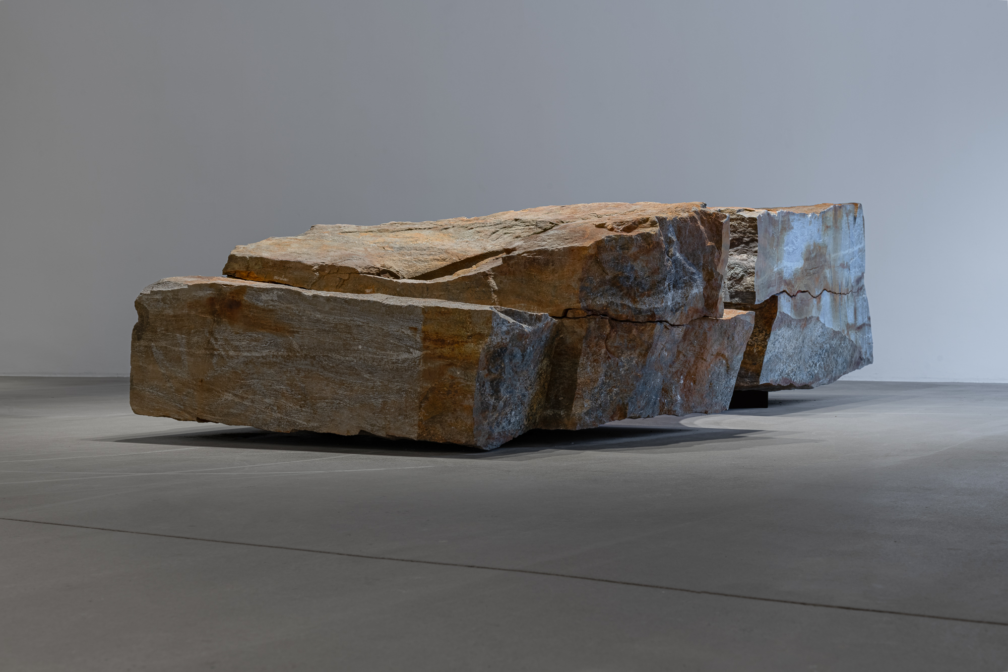 Fourth Step employs minimal and abstract gestures. Here, the fracture and seam, as well as a fragment of fabric integrated into the stone, create “micro-situations” in which the human gesture becomes inscribed in geological time. The work materializes an encounter between layers of matter and human traces in a logic where articulation gains more significance than resolution. The intervention, far from contradicting the mightiness of the material, emphasizes its stratification: mineral seams interwoven with traces of presence, labor, or thought. Through Fourth Step, the viewer can perceive a shift, an uplift, a “step toward eternity”—not in a mystical sense, but as an experience of intensified time in which each advance seems to approach something beyond the individual.