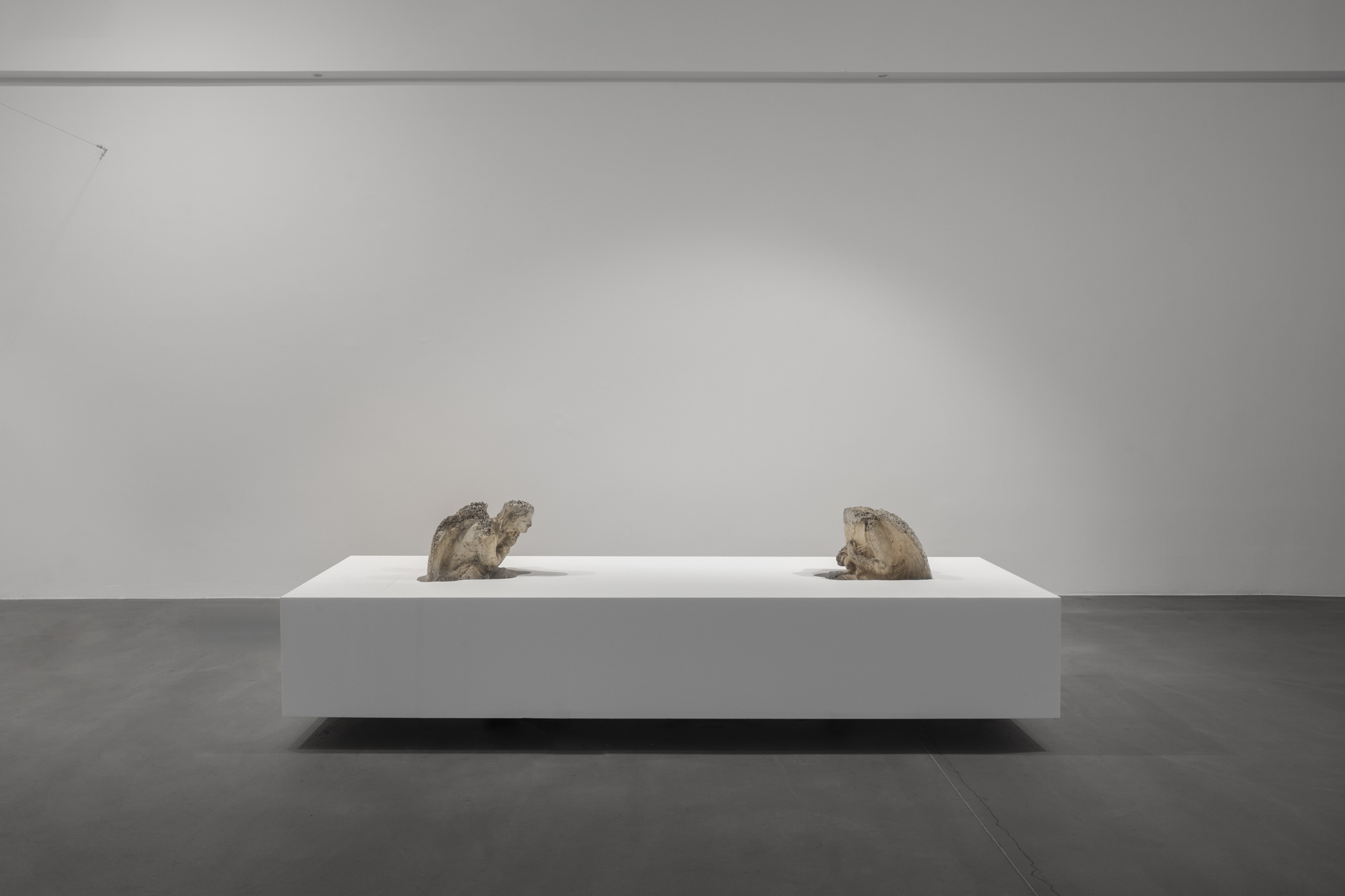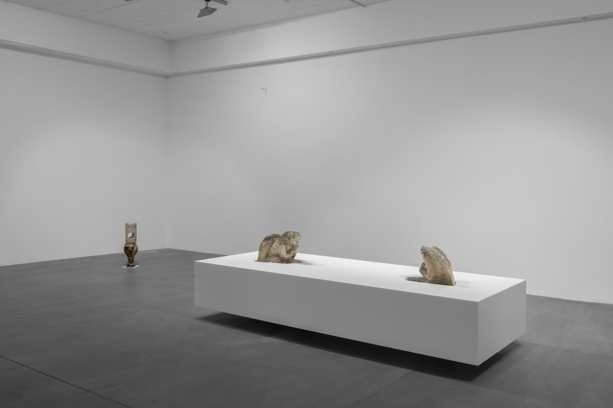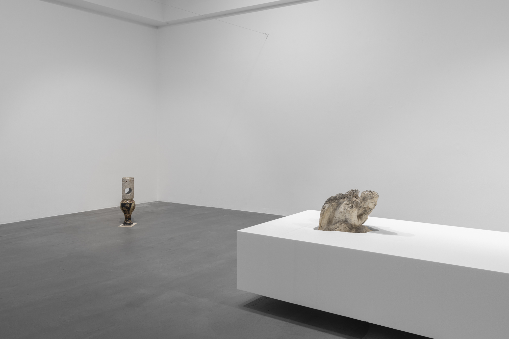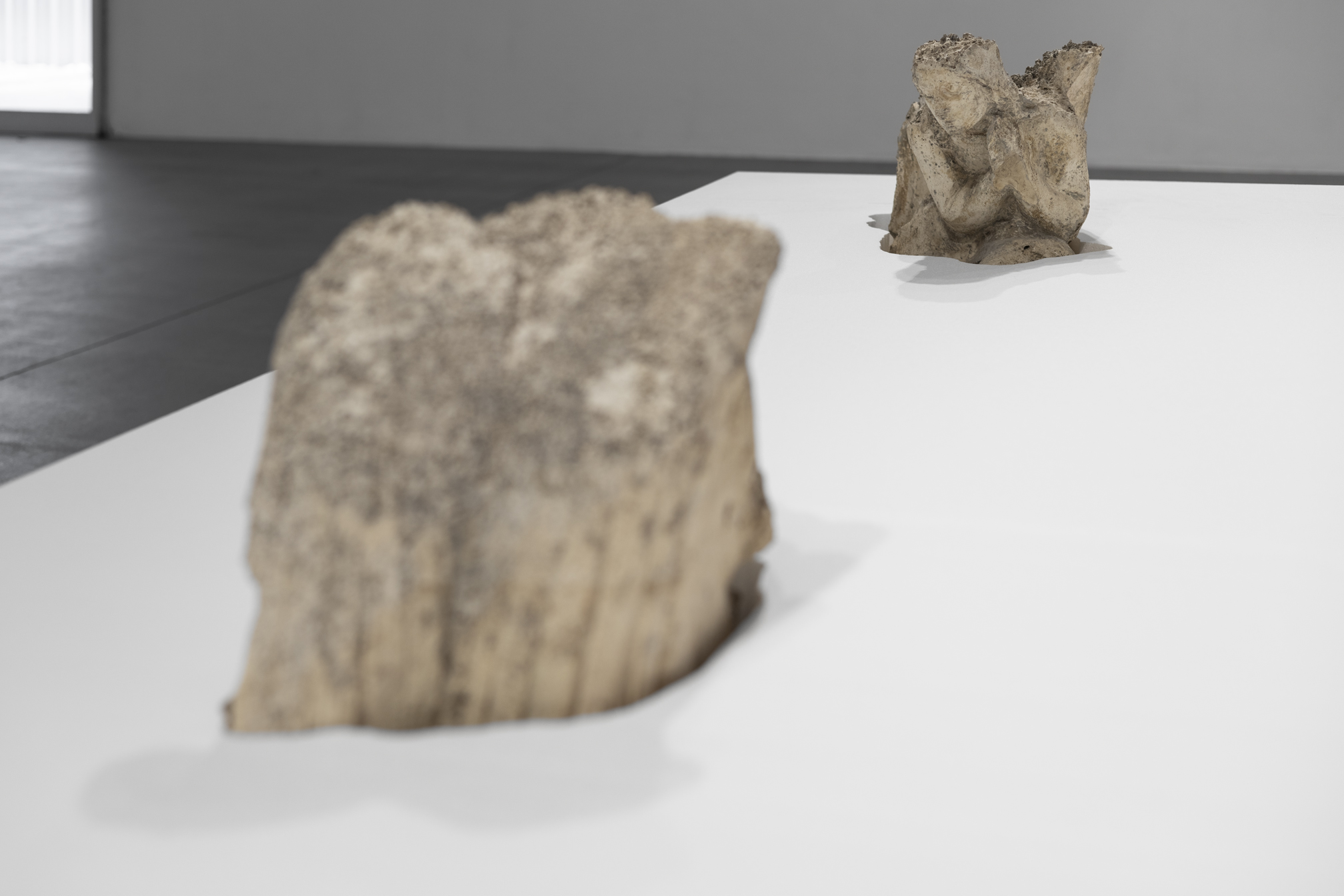 Sculptural forms, half-submerged in white blocks, appear like accidental elements—fragments of memory, cultural relics eroded by time or acid. In one of the works Aquantita (2025), the body becomes a substrate, a remnant altered by invisible corrosion— evoking the long passage of geological time and the abruptness of contemporary collapse.