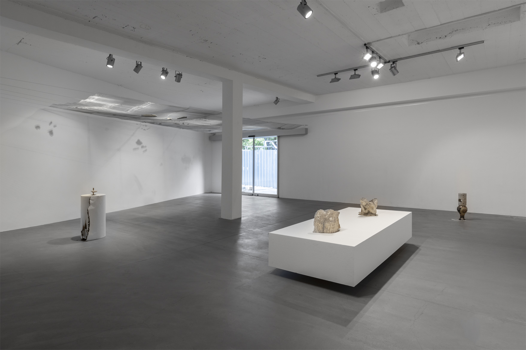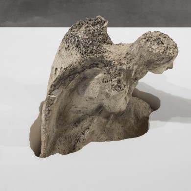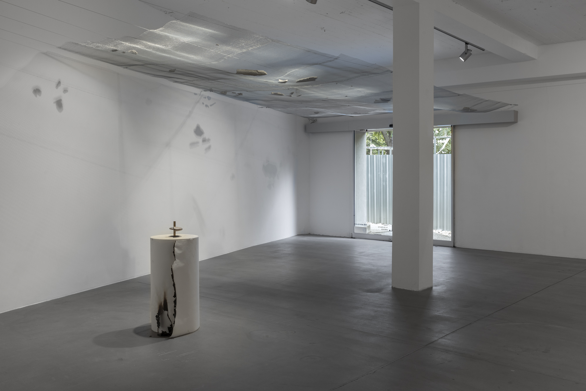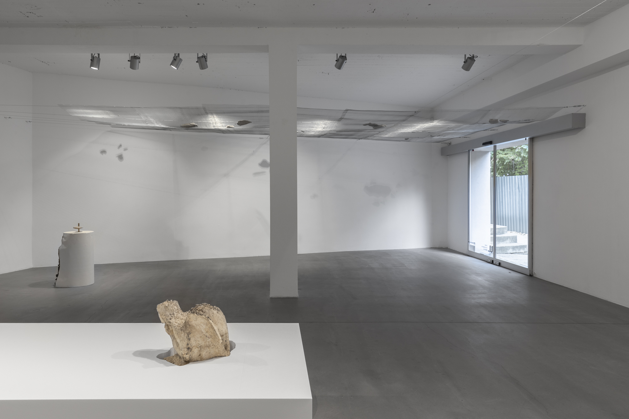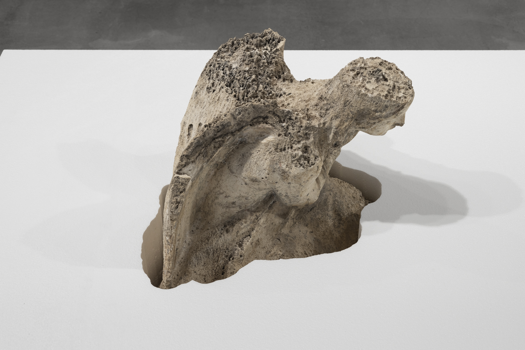 Sculptural forms, half-submerged in white blocks, appear like accidental elements—fragments of memory, cultural relics eroded by time or acid. In one of the works Aquantita (2025), the body becomes a substrate, a remnant altered by invisible corrosion— evoking the long passage of geological time and the abruptness of contemporary collapse.