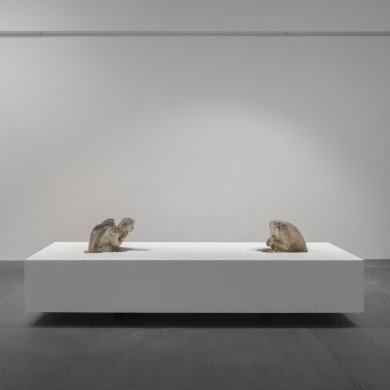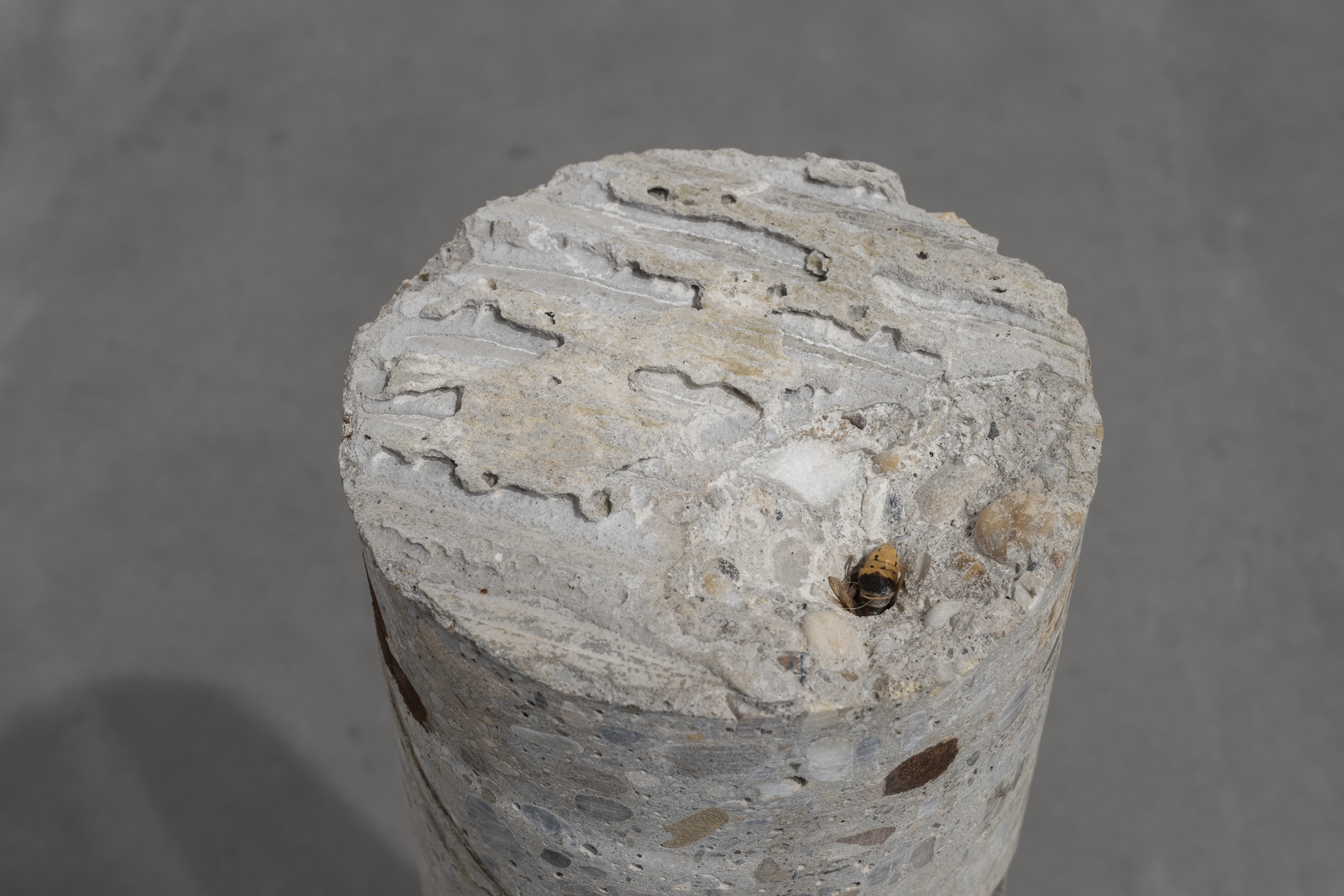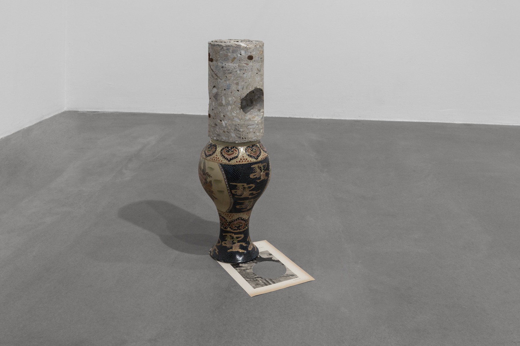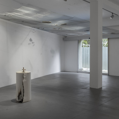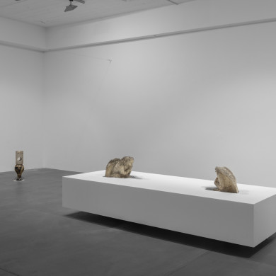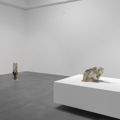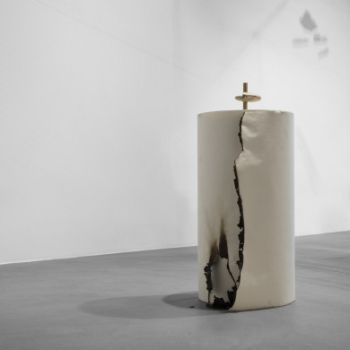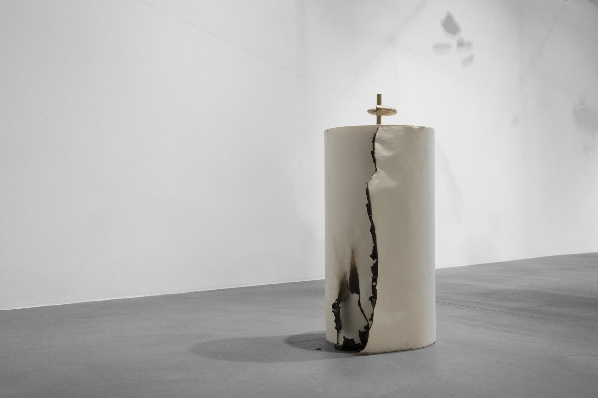 Sculptural forms, half-submerged in white blocks, appear like accidental elements—fragments of memory, cultural relics eroded by time or acid. In one of the works Aquantita (2025), the body becomes a substrate, a remnant altered by invisible corrosion— evoking the long passage of geological time and the abruptness of contemporary collapse.