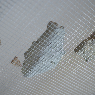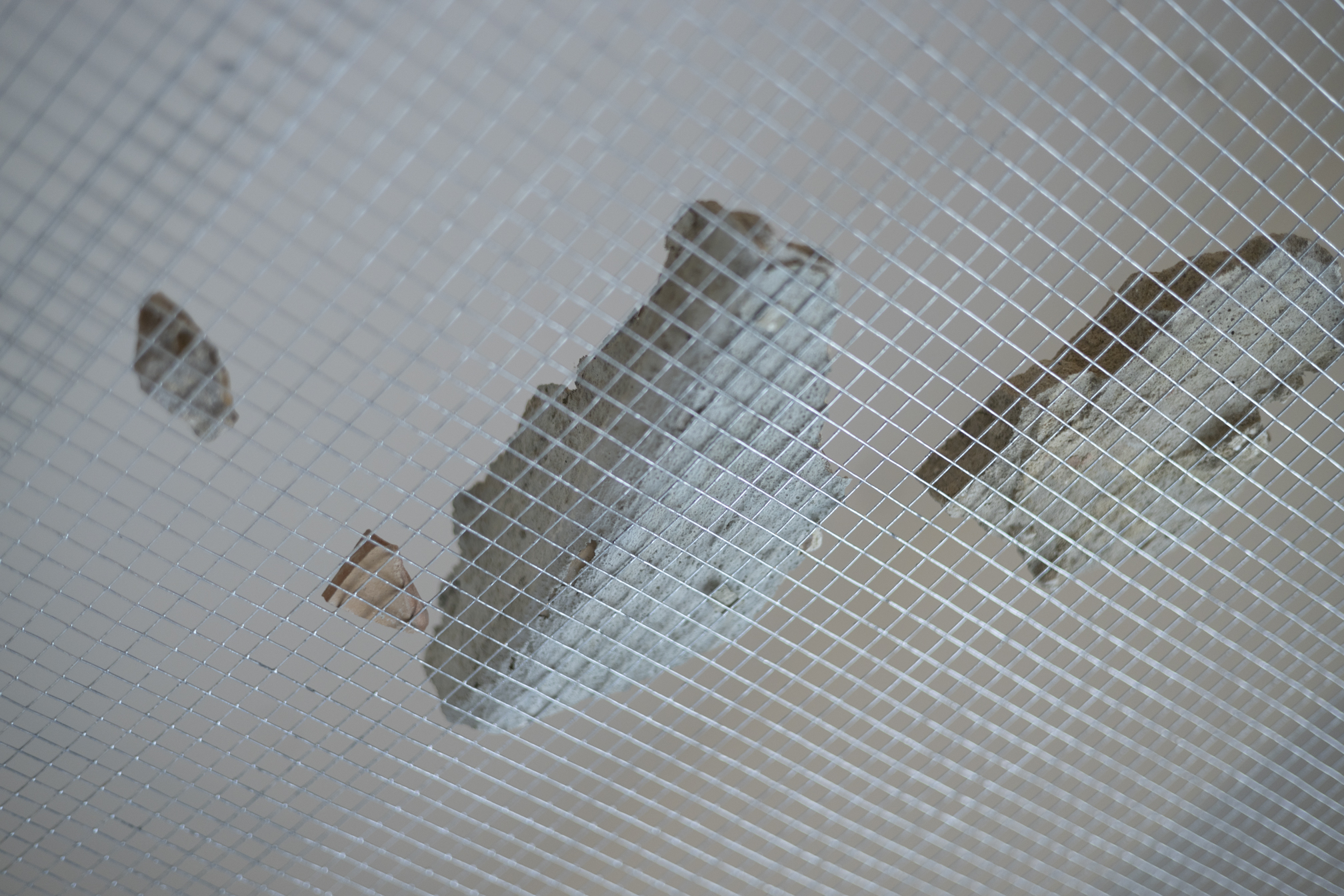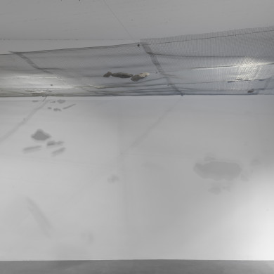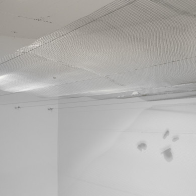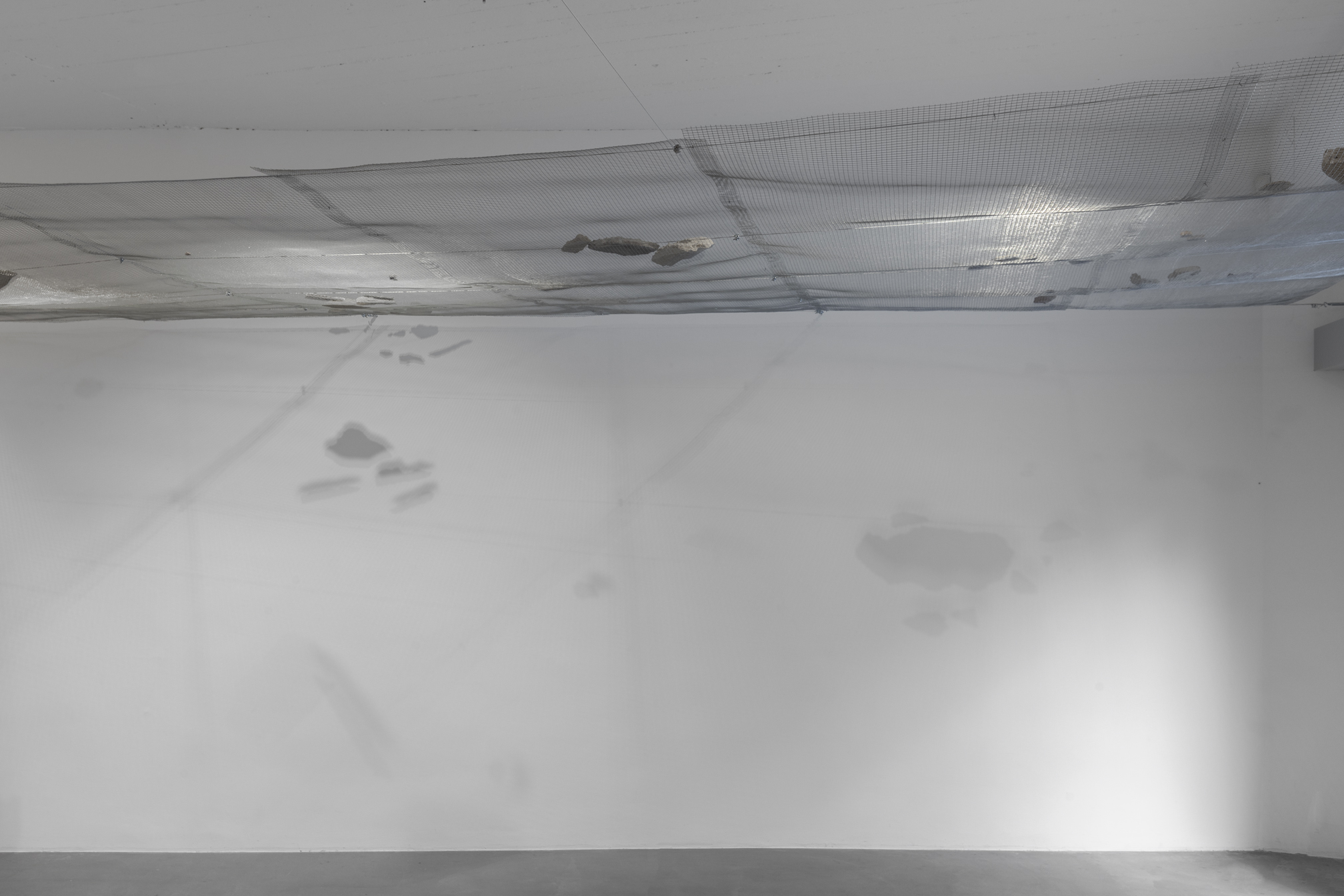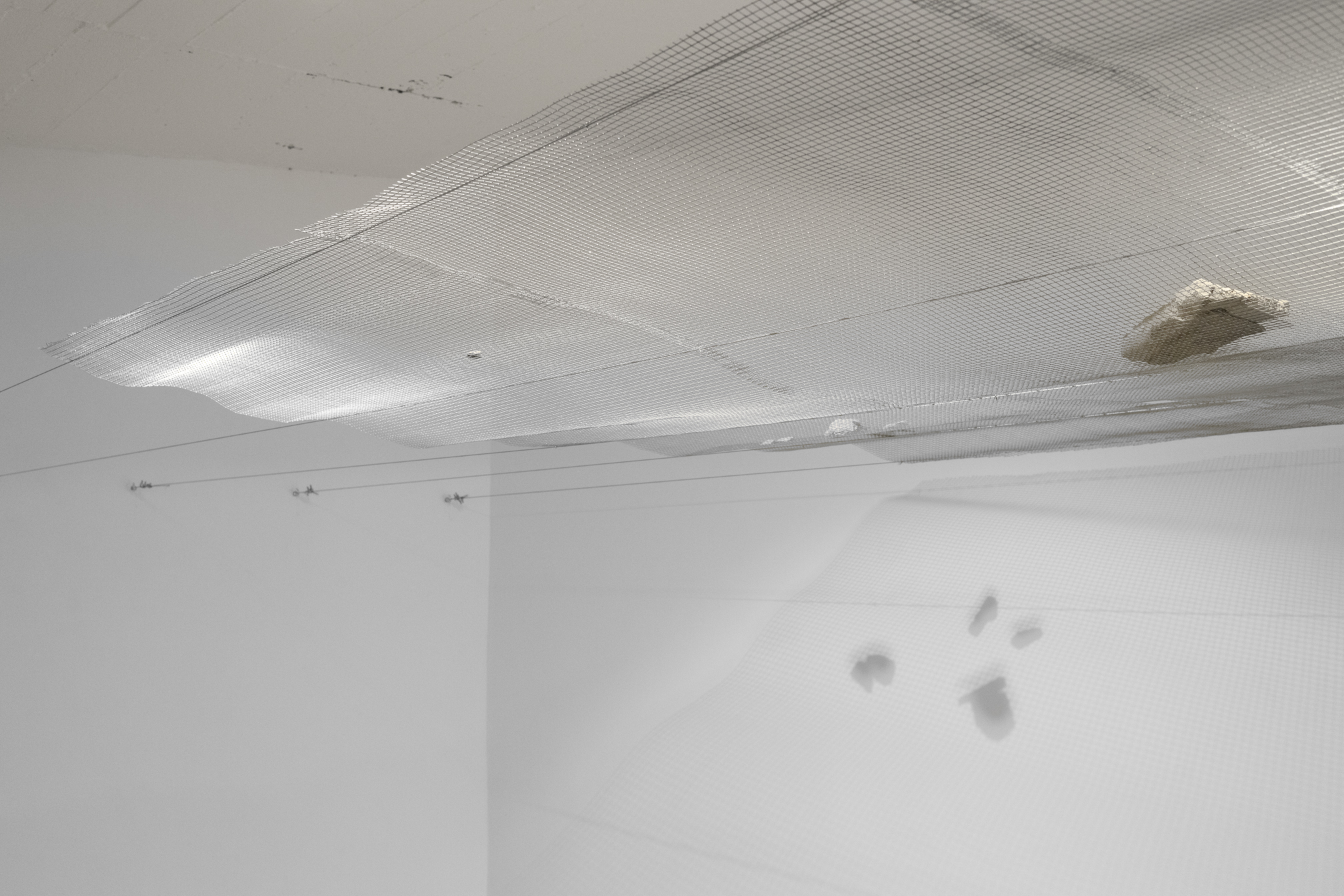 Pri vstupe víta návštevníkov kovová sieť natiahnutá nad hlavou, Pád (2025). Predostiera dvojitý prah. Je útočiskom – chráni pred latentným nebezpečenstvom. Zároveň je zdrojom napätia – v citlivom priestore, s nepredvídateľnými pádmi. Táto scénografická inštalácia je autorovou prvou „sondou“: atmosférickou, tušenou, ambivalentnou. Okamžite uvádza hlavnú tému výstavy: vnímanie toho, čo je neisté, v napätí, či neočakavané. A skryté.