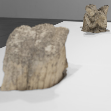 Sochárske formy, napoly potopené v bielych blokoch, sa objavujú ako náhodné prvky – úlomky pamäti, kultúrne fragmenty nahlodané časom alebo kyselinami. V diele Akvatinta (2025) sa telo stáva substrátom, pozostatkom zmeneným neviditeľnou koróziou, evokujúcim dlhý čas geologickej erózie, ale aj rýchlosť súčasných kolapsov.
